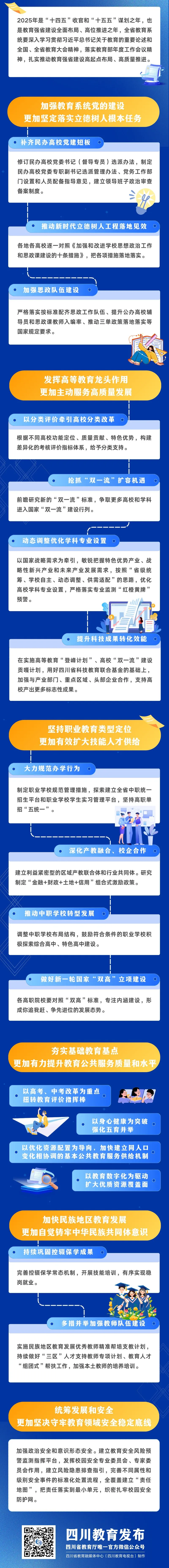 會議強調(diào),2025年是“十四五”收官和“十五五”謀劃之年,要在攻堅破難中緊抓關(guān)鍵,準確把握教育強省建設的實踐路徑。要加強教育系統(tǒng)黨的建設,補齊民辦高校黨建短板,實施新時代立德樹人工程,加強思政隊伍建設,更加堅定落實立德樹人根本任務。要發(fā)揮高等教育龍頭作用,以分類評價牽引高校分類改革,搶抓“雙一流”擴容機遇,動態(tài)調(diào)整優(yōu)化學科專業(yè)設置,提升科技成果轉(zhuǎn)化效能,更加主動服務高質(zhì)量發(fā)展。要堅持職業(yè)教育類型定位,大力規(guī)范辦學行為,深化產(chǎn)教融合、校企合作,推動中職學校轉(zhuǎn)型發(fā)展,做好新一輪國家“雙高”立項建設,更加有效擴大技能人才供給。要夯實基礎教育基點,以高考、中考改革為重點,扭轉(zhuǎn)教育評價指揮棒;以身心健康為突破,強化五育并舉;以優(yōu)化資源配置為導向,加快建立同人口變化相協(xié)調(diào)的基本公共教育服務供給機制;以教育數(shù)字化為驅(qū)動,擴大優(yōu)質(zhì)資源覆蓋面,更加有力提升教育公共服務質(zhì)量和水平。要加快民族地區(qū)教育發(fā)展,持續(xù)鞏固控輟保學成果,多措并舉加強教師隊伍建設,更加自覺鑄牢中華民族共同體意識。要統(tǒng)籌發(fā)展和安全,提升安全工作專業(yè)性、預見性,把責任落實到最小單元,確保政治安全和意識形態(tài)安全,更加堅決守牢教育領域安全穩(wěn)定底線。