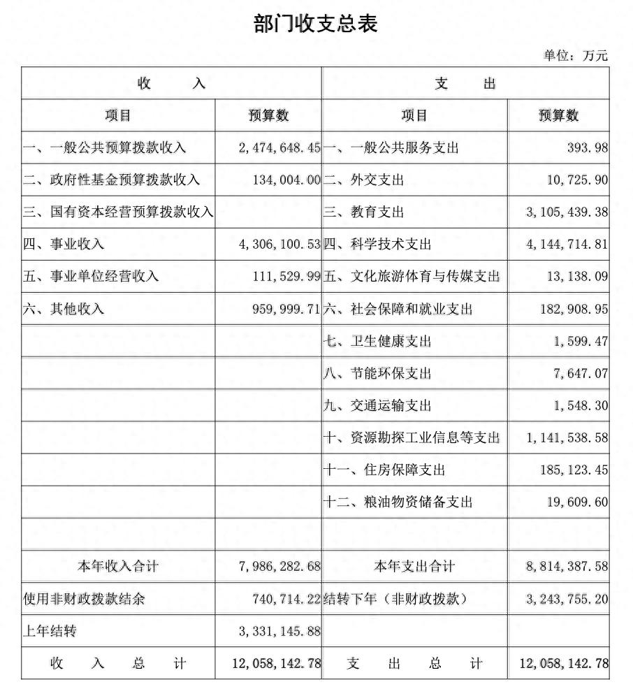 據(jù)預(yù)算顯示,收入總計12,058,142.78萬元,其中本年收入合計7,986,282.68萬元,使用非財政撥款結(jié)余740,714.22萬元,上年結(jié)轉(zhuǎn)3,331,145.88萬元。