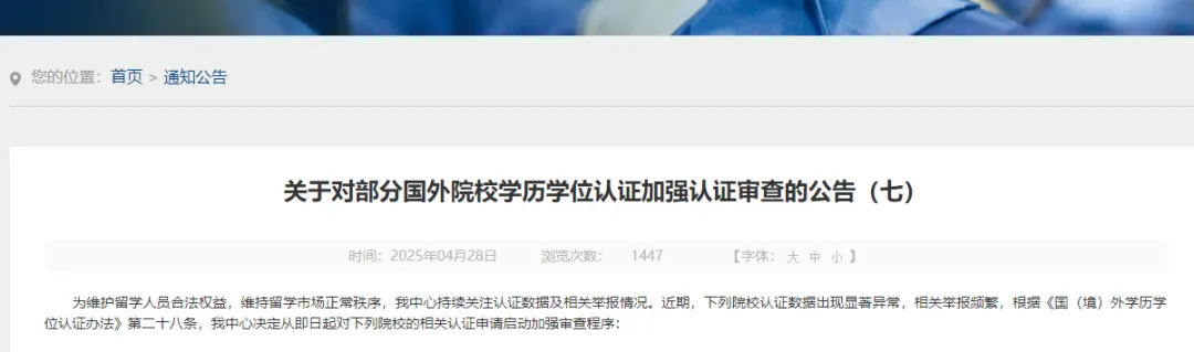 4月28日,教育部留學服務中心發(fā)布《關(guān)于對部分國外院校學歷學位認證加強認證審查的公告(七)》。對多所認證數(shù)據(jù)出現(xiàn)顯著異常的國外院校(項目)的相關(guān)認證申請啟動加強審查程序。