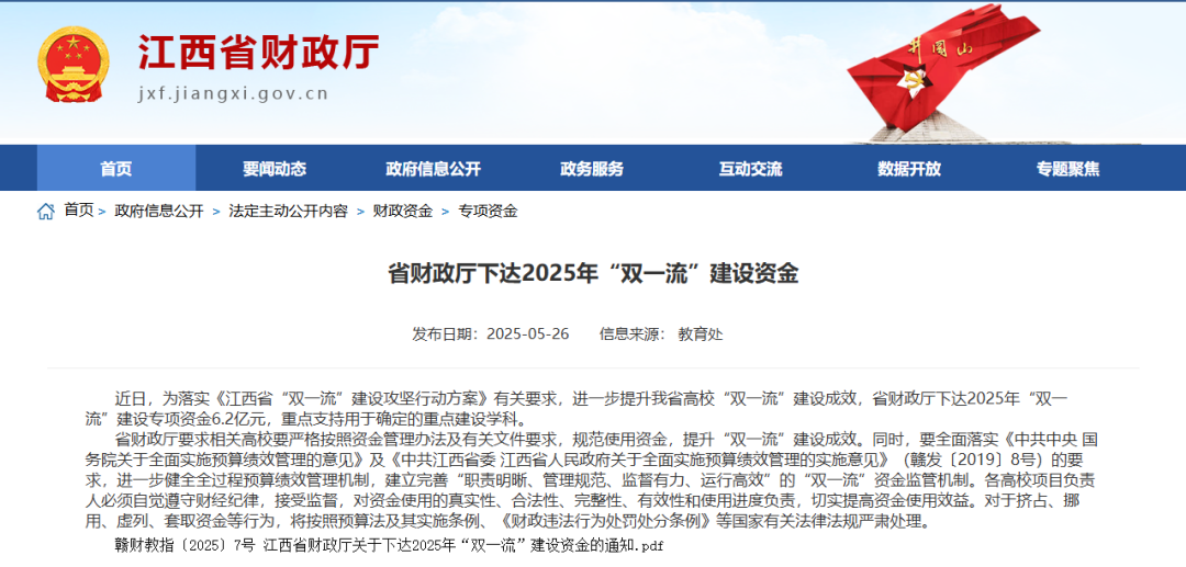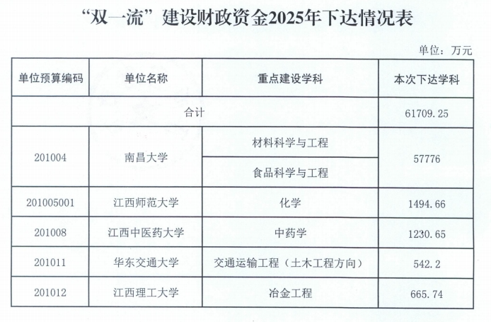 近日,為落實(shí)《江西省“雙一流”建設(shè)攻堅(jiān)行動(dòng)方案》有關(guān)要求,進(jìn)一步提升江西高校“雙一流”建設(shè)成效,省財(cái)政廳下達(dá)2025年“雙一流”建設(shè)專項(xiàng)資金6.2億元,重點(diǎn)支持用于確定的重點(diǎn)建設(shè)學(xué)科。