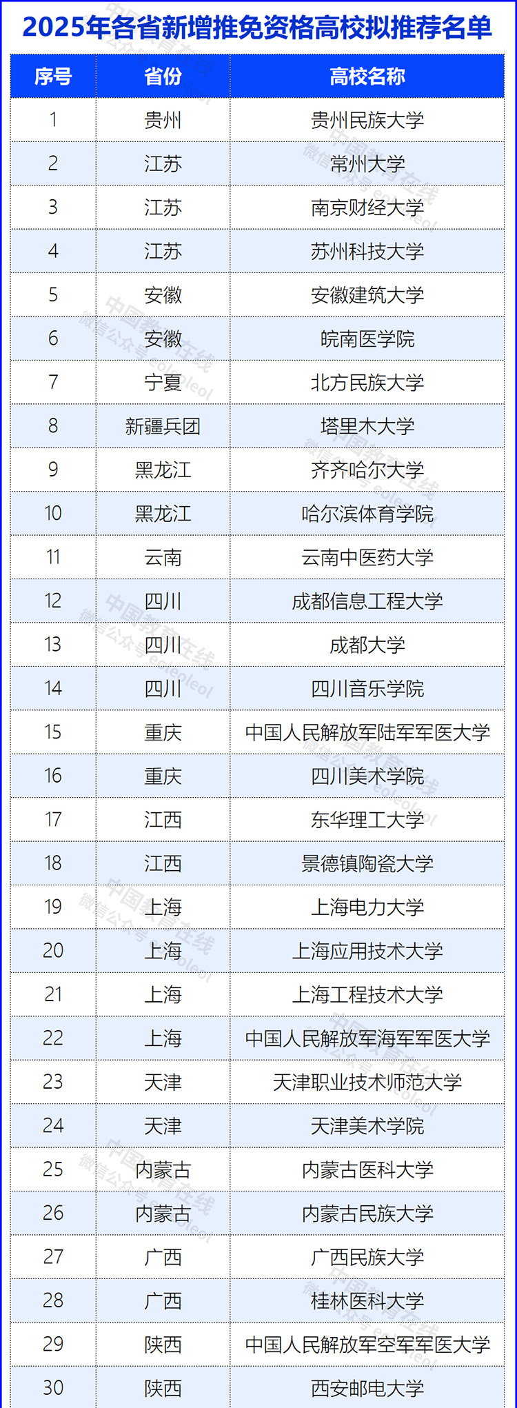 根據(jù)《教育部辦公廳關(guān)于做好新增推免資格高校申報(bào)及確認(rèn)工作的通知》(教學(xué)廳〔2025〕4號)要求,經(jīng)廳黨組會研究,確定2025年浙江省新增推免資格高校擬推薦名單,現(xiàn)予以公示,推薦名單如下: