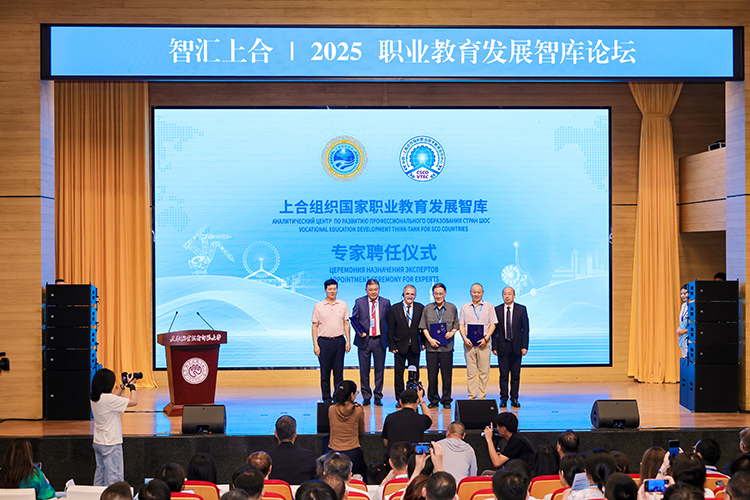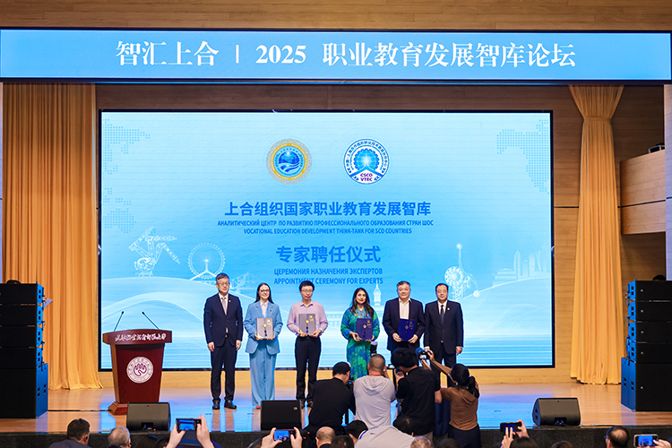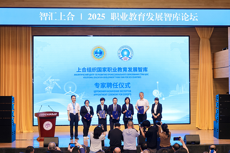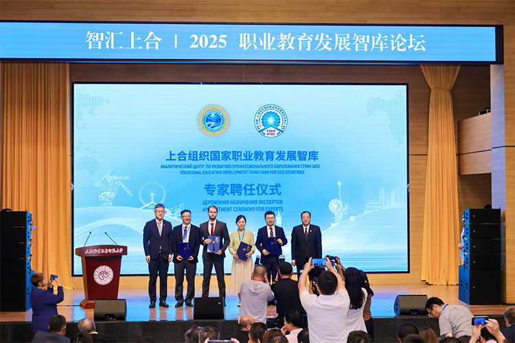 上合組織國家職業(yè)教育發(fā)展智庫專家聘任環(huán)節(jié),中國教育部課程教材研究所副所長曾天山,天津教育委員會副主任羅延安,天津職業(yè)技術(shù)師范大學(xué)校務(wù)委員會主席張金剛,天津職業(yè)技術(shù)師范大學(xué)校長鄭清春,中國教育部魯班工坊建設(shè)專家委員會主任呂景泉,天津職業(yè)技術(shù)師范大學(xué)黨委副書記李靖為智庫專家頒發(fā)聘書。