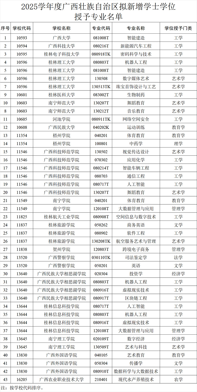 9月12日,廣西壯族自治區(qū)教育廳發(fā)布《自治區(qū)學(xué)位委員會關(guān)于2025學(xué)年度擬新增學(xué)士學(xué)位授予專業(yè)的公示》。根據(jù)《廣西壯族自治區(qū)學(xué)士學(xué)位授權(quán)與授予管理辦法》(桂教規(guī)范〔2022〕7號),經(jīng)組織專家組評議,廣西大學(xué)等20所高校申請新增的43個學(xué)士學(xué)位授予專業(yè)通過審核,現(xiàn)將擬新增名單予以公示。