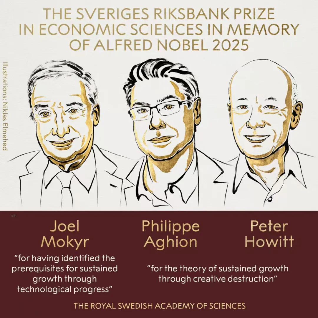 北京時間10月13日,2025年諾貝爾經(jīng)濟學(xué)獎獲獎得主揭曉。2025年諾貝爾經(jīng)濟學(xué)獎授予Joel Mokyr、Philippe Aghion、Peter Howitt,以表彰他們“解釋了創(chuàng)新驅(qū)動的經(jīng)濟增長”。其中一半授予Joel Mokyr,以表彰他“通過技術(shù)進(jìn)步確定了持續(xù)增長的先決條件”,另一半則共同授予Philippe Aghion、Peter Howitt,以表彰他們關(guān)于“通過創(chuàng)造性破壞實現(xiàn)持續(xù)增長”的理論。獲獎獎金為1100萬瑞典克朗(約合人民幣826萬元)。