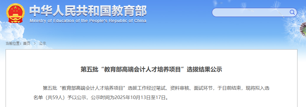 10月13日,教育部財務(wù)司發(fā)布第五批“教育部高端會計人才培養(yǎng)項目”選拔結(jié)果的公示。