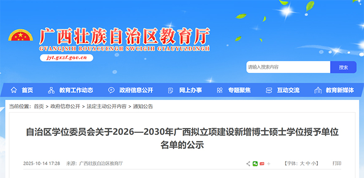 10月14日,廣西壯族自治區(qū)教育廳發(fā)布《自治區(qū)學位委員會關于2026—2030年廣西擬立項建設新增博士碩士學位授予單位名單的公示》。公示顯示,廣西科技大學等5所高校擬增列為博士學位授予立項建設單位,梧州學院等10所高校擬增列為碩士學位授予立項建設單位。