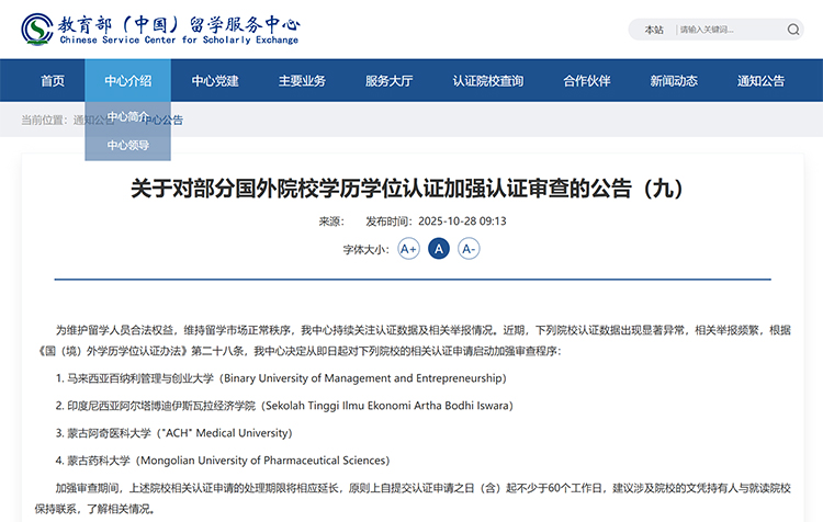 10月28日,教育部留學(xué)服務(wù)中心發(fā)布《關(guān)于對(duì)部分國外院校學(xué)歷學(xué)位認(rèn)證加強(qiáng)認(rèn)證審查的公告(九)》,決定對(duì)4所海外院校的相關(guān)認(rèn)證申請(qǐng)啟動(dòng)加強(qiáng)審查程序。