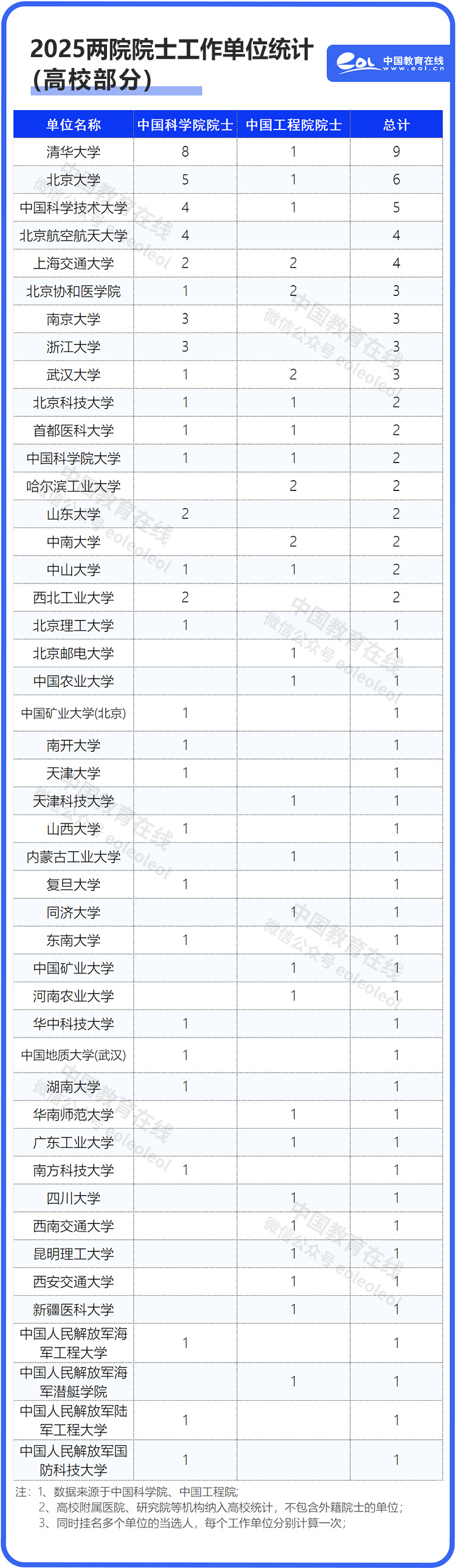 2025年兩院增選院士工作單位(高校部分)統(tǒng)計(jì)如下(不含外籍院士):