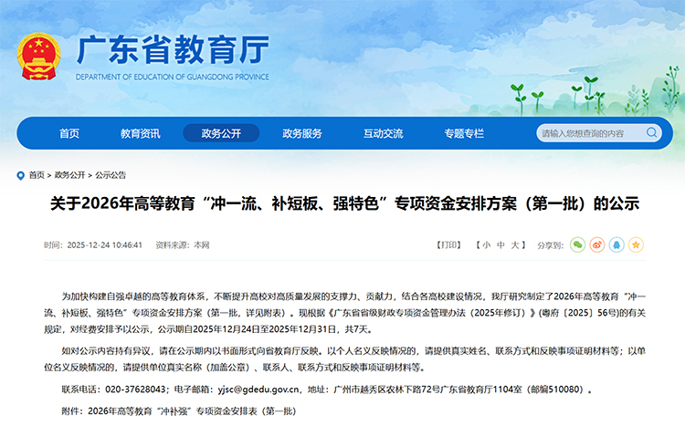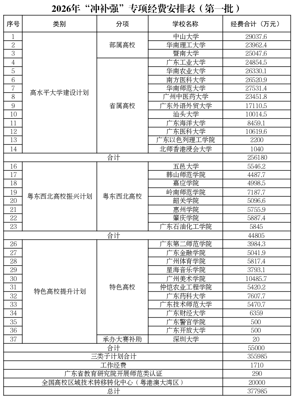 12月24日,廣東省教育廳公布《關(guān)于2026年高等教育“沖一流、補短板、強特色”專項資金安排方案(第一批)的公示》,擬安排37.7985億元支持34所高?!皼_補強”。