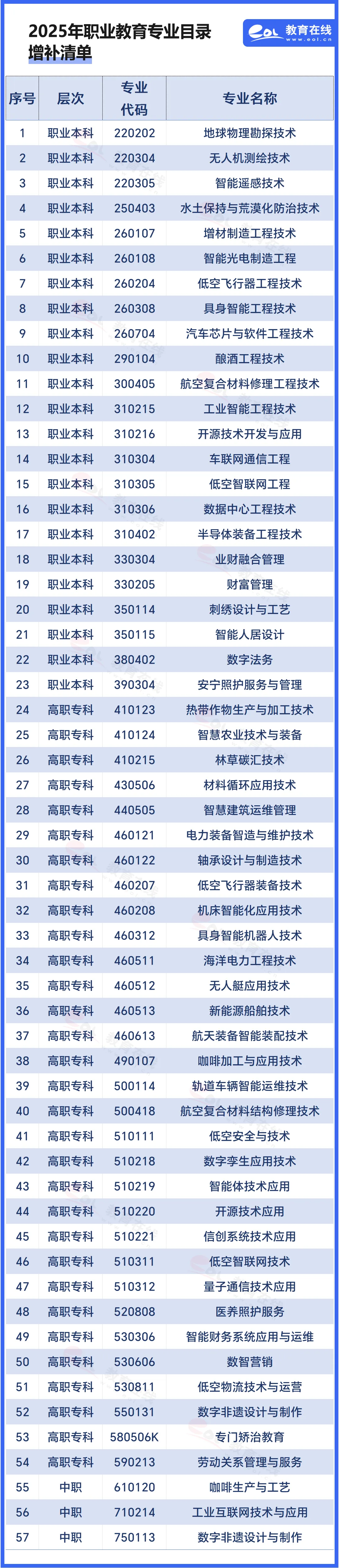 2025年7月,教育部職成司發(fā)布《關(guān)于組織開展2025年職業(yè)教育專業(yè)目錄增補專業(yè)論證工作的通知》,其主要任務(wù)顯示,圍繞國家戰(zhàn)略和區(qū)域、行業(yè)高質(zhì)量發(fā)展新需求,促進專業(yè)設(shè)置與區(qū)域產(chǎn)業(yè)布局緊密對接,在現(xiàn)行《職業(yè)教育專業(yè)目錄(2021年)》基礎(chǔ)上,對職業(yè)教育中職、高職專科、職業(yè)本科專業(yè)目錄提出增補專業(yè)建議。