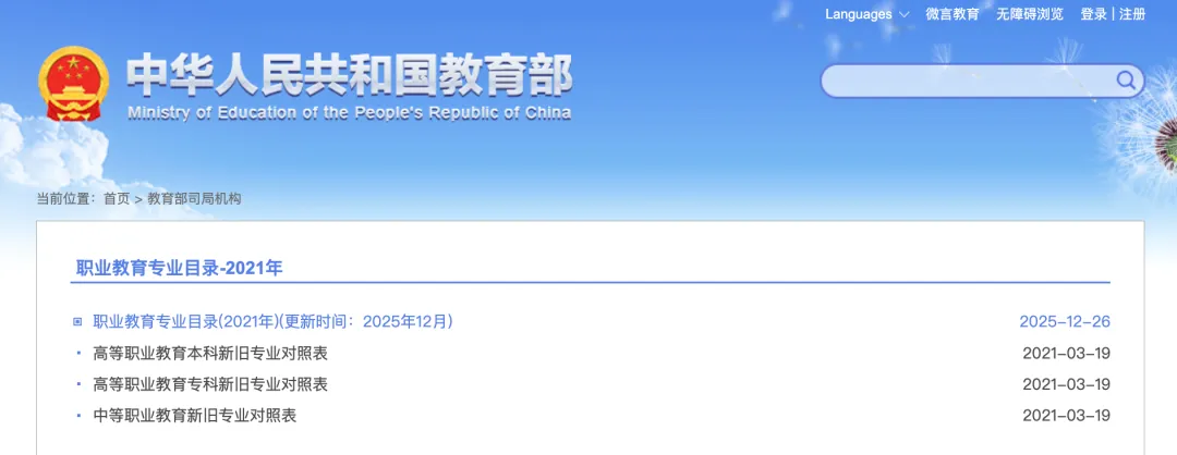 2025年12月26日,教育部官網(wǎng)更新《職業(yè)教育專業(yè)目錄(2021年)》。
