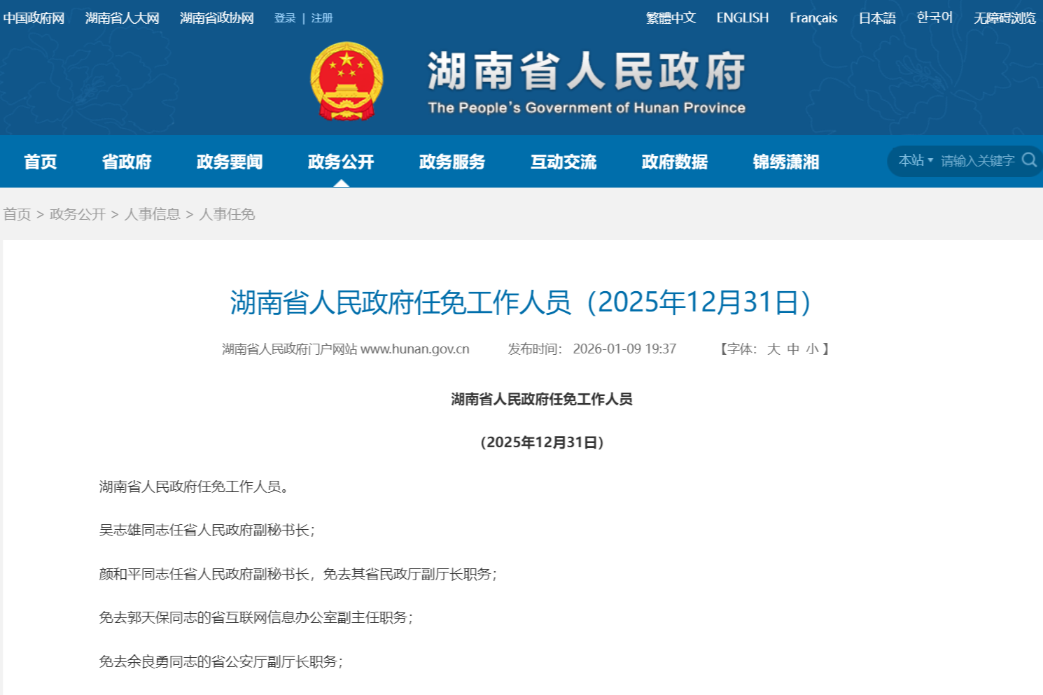 湖南省人民政府網(wǎng)站1月9日發(fā)布消息,2025年12月31日,湖南省人民政府任免工作人員,涉及多所高校。