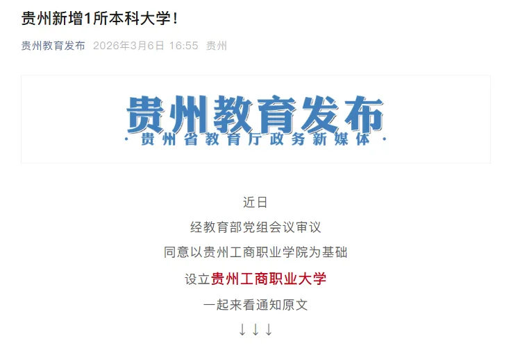 3月6日,“貴州教育發(fā)布”微信公眾號(hào)發(fā)布資訊表示,近日,經(jīng)教育部黨組會(huì)議審議同意以貴州工商職業(yè)學(xué)院為基礎(chǔ)設(shè)立貴州工商職業(yè)大學(xué)。