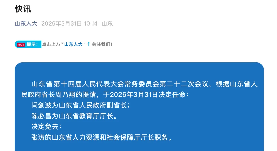山東省第十四屆人民代表大會常務(wù)委員會第二十二次會議,根據(jù)山東省人民政府省長周乃翔的提請,于2026年3月31日決定任命: