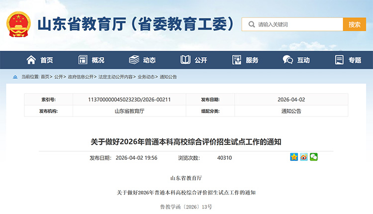 近日,山東省教育廳發(fā)布《關(guān)于做好2026年普通本科高校綜合評價招生試點工作的通知》。今年山東綜合評價招生試點高校為10所,分別是:山東大學、中國海洋大學、中國石油大學(華東)、哈爾濱工業(yè)大學(威海)、青島大學、山東師范大學、山東科技大學、青島科技大學、山東財經(jīng)大學、華南理工大學。