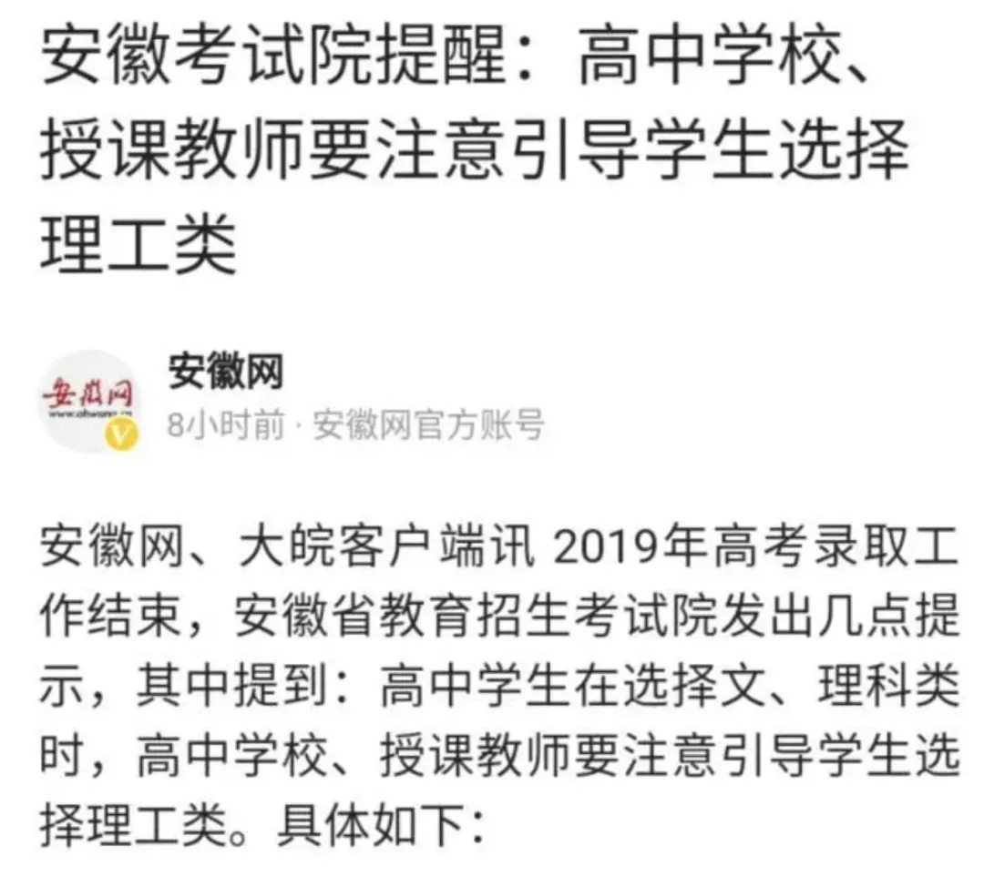 2019年安徽教育招生考試院就曾呼吁考生盡量學(xué)理科,因?yàn)楸究莆睦碚猩冉咏?:3,即招3個(gè)理科生才招1個(gè)文科生。疊加文科與理科考試上的不同,一般文科線比理科線高幾十分是正常的。曾有一年某省文科本科線比理科高了近100分。
