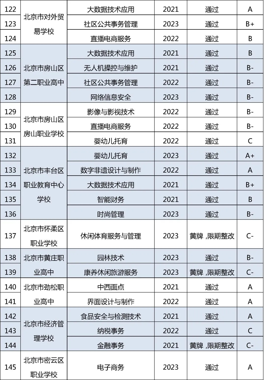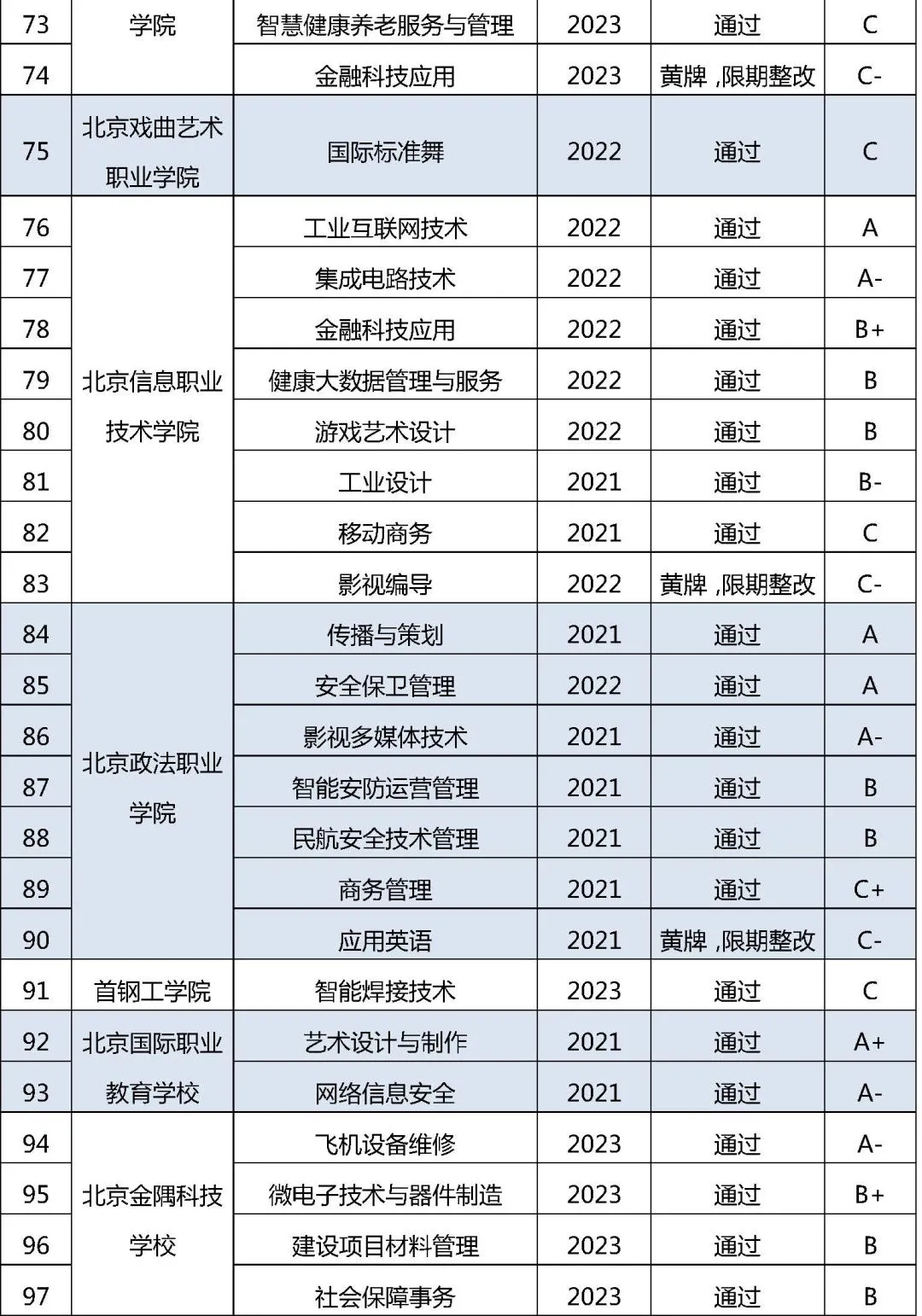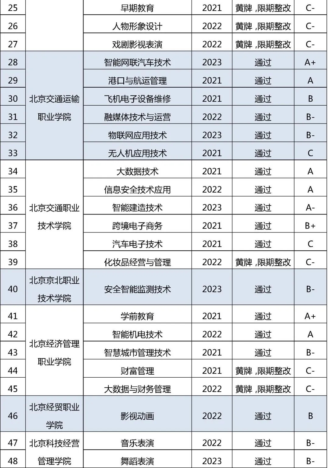 近日,2024年北京市職業(yè)院校近三年新增專業(yè)質(zhì)量監(jiān)測(cè)評(píng)價(jià)結(jié)果公布。評(píng)價(jià)結(jié)果顯示,36所職校163個(gè)專業(yè)予以通過,17所職校的28個(gè)專業(yè)給予“黃牌、限期整改”,要求限期整改。其中,9所高職的13個(gè)專業(yè)為“黃牌、限期整改”。