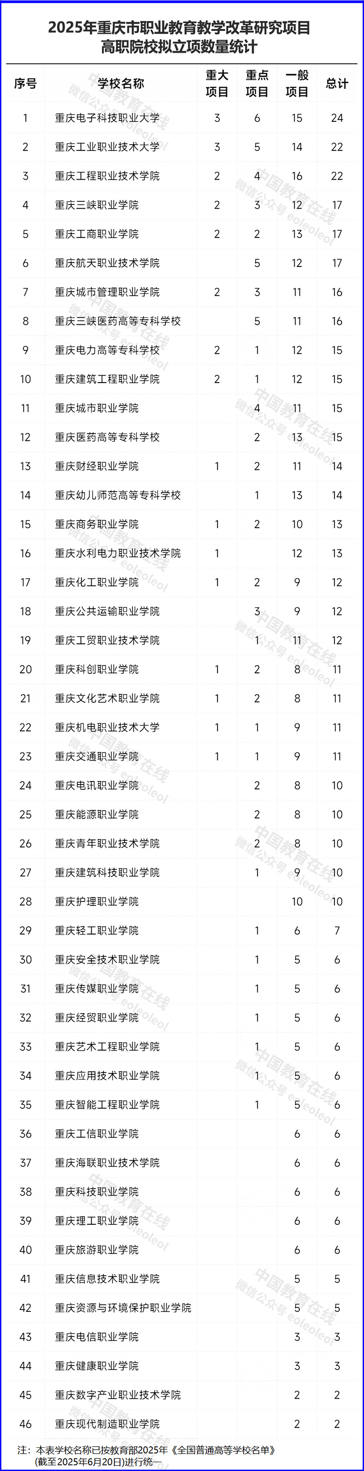 10月27日,重慶市教育委員會(huì)發(fā)布《2025年重慶市職業(yè)教育教學(xué)改革研究項(xiàng)目擬立項(xiàng)名單公示》。根據(jù)相關(guān)文件要求,經(jīng)個(gè)人申報(bào)、學(xué)校推薦、專家評(píng)審?fù)扑],2025年度擬立項(xiàng)職業(yè)教育教學(xué)改革研究項(xiàng)目652項(xiàng),其中重大項(xiàng)目38項(xiàng)、重點(diǎn)項(xiàng)目93項(xiàng)、一般項(xiàng)目521項(xiàng)。