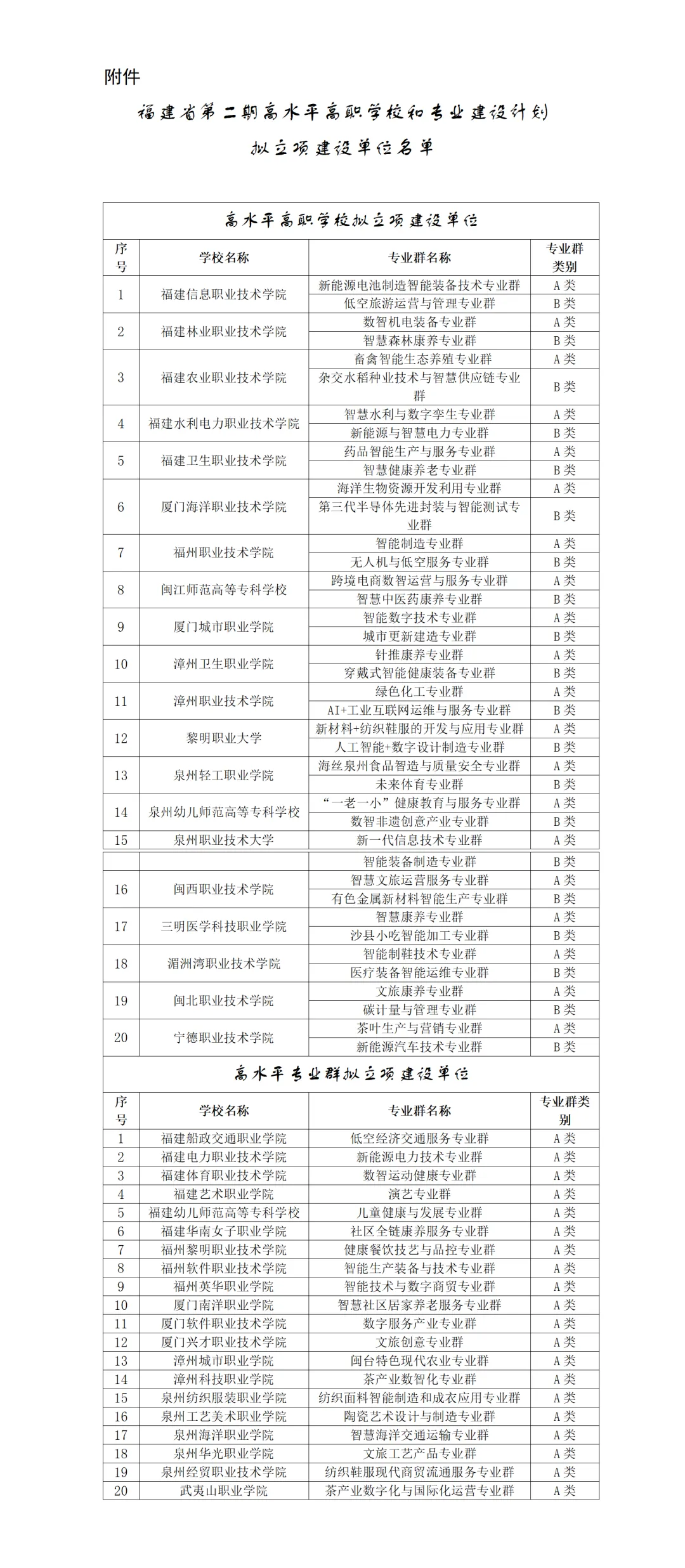 根據(jù)《福建省教育廳福建省財(cái)政廳關(guān)于開展“福建省高水平職業(yè)學(xué)校和專業(yè)建設(shè)計(jì)劃”第一期驗(yàn)收和第二期申報(bào)工作的通知》(閩教職成〔2025〕13號(hào))要求,我省組織開展第二期高水平高職學(xué)校和專業(yè)建設(shè)計(jì)劃項(xiàng)目申報(bào)與評(píng)審工作。經(jīng)學(xué)校申報(bào)、資格審查、專家評(píng)審,現(xiàn)將擬建設(shè)項(xiàng)目學(xué)校名單予以公示。公示時(shí)間:2026年1月5日至1月9日。根據(jù)公示名單,20所高校入選高水平高職學(xué)校擬立項(xiàng)建設(shè)單位,20所高校入選高水平專業(yè)群擬立項(xiàng)建設(shè)單位。