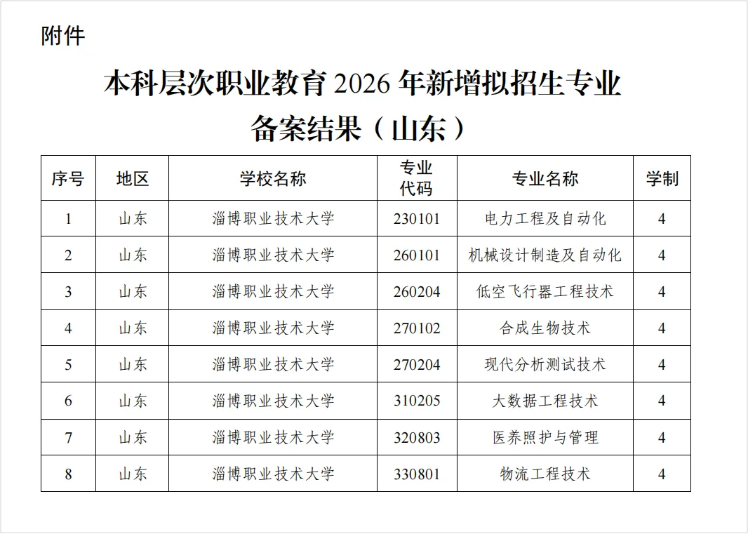 近日,教育部辦公廳公布2026年本科層次職業(yè)教育專業(yè)設置備案結果,淄博職業(yè)技術大學申報的電力工程及自動化、機械設計制造及自動化、低空飛行器工程技術、合成生物技術、現(xiàn)代分析測試技術、大數(shù)據(jù)工程技術、醫(yī)養(yǎng)照護與管理、物流工程技術等8個四年制職業(yè)本科專業(yè)獲批。