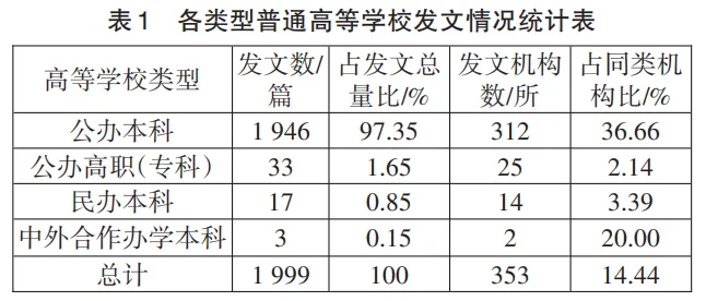 在納入統(tǒng)計范圍的2151篇高等教育科研論文中,剔除第一作者署名單位為境外高校(含港澳臺)以及政府機關(guān)、教育服務(wù)機構(gòu)、科研院所、軍事院校等的文章152篇,獲得第一作者署名單位為境內(nèi)普通高校的高等教育科研論文共計1999篇,以此作為本分析報告的數(shù)據(jù)基礎(chǔ)。