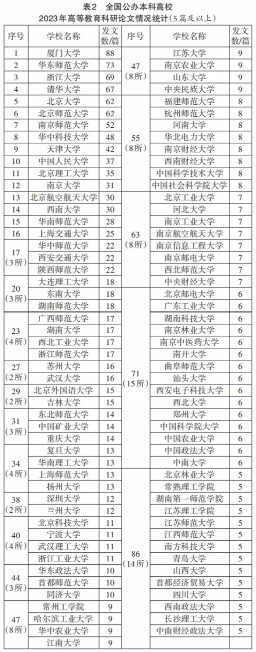 為更好地跟蹤、掌握我國高等教育科學(xué)研究的現(xiàn)狀與特征,服務(wù)于中國教育學(xué)自主知識體系建構(gòu),《中國高教研究》編輯部近期完成了2023年全國高校高等教育科研論文的統(tǒng)計分析工作。本次統(tǒng)計論文收錄期刊的范圍為中文社會科學(xué)引文索引(CSSCI)(2023—2024年)與《中文核心期刊要目總覽》(2023年版)中高等教育類“雙核”期刊,以及復(fù)合影響因子2.9以上、綜合影響因子2.1以上的教育綜合類“雙核”期刊,且均為“2022年度中國人文社會科學(xué)期刊AMI綜合評價”收錄期刊,共計23家。