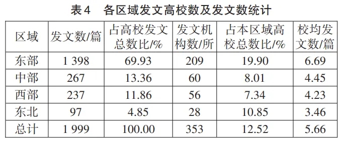 2023年東部地區(qū)高等教育科研發(fā)文高校占本區(qū)域高??倲?shù)的比例接近20%,相比之下其他3個區(qū)域的占比偏低;從區(qū)域高校發(fā)文數(shù)量與占高校發(fā)文總數(shù)的比例來看,東部地區(qū)也遙遙領(lǐng)先;從校均發(fā)文來看,東部地區(qū)校均發(fā)文6.69篇,遠高于中部地區(qū)的4.45篇,西部地區(qū)的4.23篇、東北地區(qū)的3.46篇。