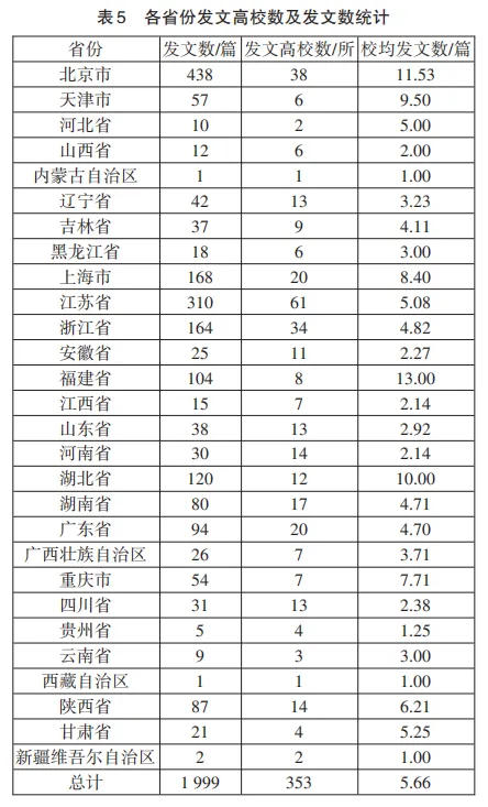 從省域分布來看,2023年度高等教育科研發(fā)文總量超過100篇的有6個省份,分別為北京、江蘇、上海、浙江、湖北、福建;從校均發(fā)文來看,福建、北京、湖北、天津、上海、重慶、陜西超過全國平均水平;海南、青海、寧夏3省區(qū)無高校發(fā)文。(見表5)數(shù)據(jù)顯示的高發(fā)文量和校均發(fā)文量一方面與高等教育資源優(yōu)勢省份呈現(xiàn)一致性,如優(yōu)質(zhì)高等教育資源集聚的北京、天津、上海、江蘇、湖北、浙江等都是論文高產(chǎn)出省份;另一方面也與高等教育學(xué)科發(fā)展的優(yōu)勢高校所在省份表現(xiàn)出高度的一致性,如作為高等教育學(xué)科優(yōu)勢高校的廈門大學(xué)一校的發(fā)文量占到全省發(fā)文量的84.62%,天津大學(xué)、華東師范大學(xué)、浙江大學(xué)、華中科技大學(xué)分別占到其所在省份發(fā)文量的73.68%、43.45%、42.07%、40.00%,成為省域發(fā)文的產(chǎn)出大戶。