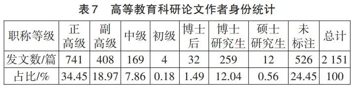 在統(tǒng)計作者署名情況的2151篇論文中,兩人聯(lián)合署名是占比最高的署名形式,其次為單獨署名。統(tǒng)計發(fā)現(xiàn),聯(lián)合署名的總占比達67.04%,這顯示出高等教育科研活動中合作研究已經(jīng)成為主流方式,呈現(xiàn)出有組織科研的雛形。高等教育學(xué)科發(fā)展進入成熟化階段,跨學(xué)科、跨主體的研究越來越深入,采用多樣化的研究方法、多學(xué)科的研究視角、多主體的信息采集方式使得不同背景的研究者組建起復(fù)合型研究團隊開展更深入、更廣闊的有組織研究。(見表6)以團隊形態(tài)開展的高等教育研究主題值得進一步分析挖掘,以反映高等教育科研的深層次結(jié)構(gòu)。