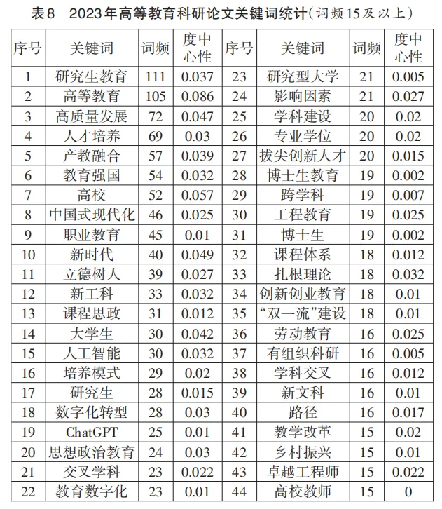綜合考量高頻關(guān)鍵詞的詞頻和度中心性的分布情況并征求多位專家意見后,確定2023年度高等教育研究十大學(xué)術(shù)熱點,分別為教育高質(zhì)量發(fā)展、建設(shè)教育強國、產(chǎn)教融合與校企合作、人才培養(yǎng)改革、教育數(shù)字化與智能化、新工科建設(shè)、課程思政、交叉學(xué)科、創(chuàng)新創(chuàng)業(yè)教育、勞動教育。本刊邀請了十位專家學(xué)者聚焦十大學(xué)術(shù)熱點展開研究評述,以反映各熱點領(lǐng)域的學(xué)術(shù)動態(tài)與發(fā)展趨勢。