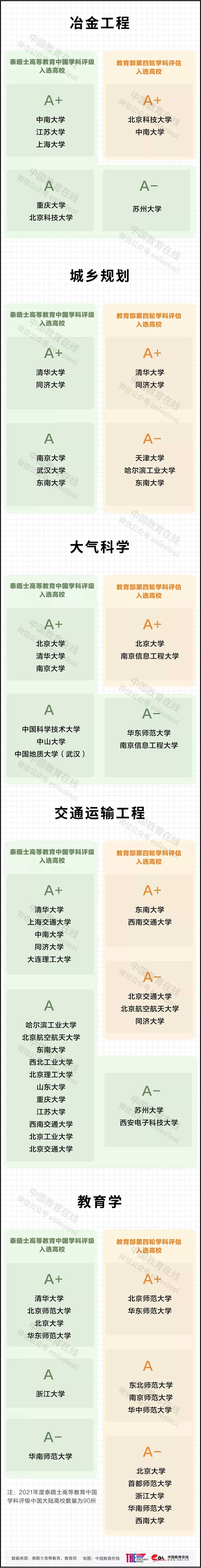 評級(jí)結(jié)果還表明,中國大陸高校在五個(gè)學(xué)科取得了成功:冶金工程(A)、城鄉(xiāng)規(guī)劃(A)、大氣科學(xué)(A-)、交通工程(A-)和教育學(xué)(A-)的評級(jí)均優(yōu)于英國、美國、加拿大、澳大利亞和德國。