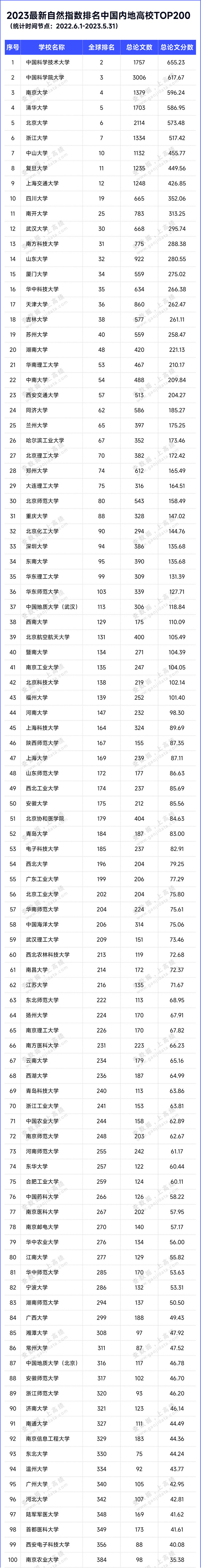2023最新自然指數(shù)排名中國內(nèi)地高校TOP200名單(2022.6.1-2023.5.31)如下: