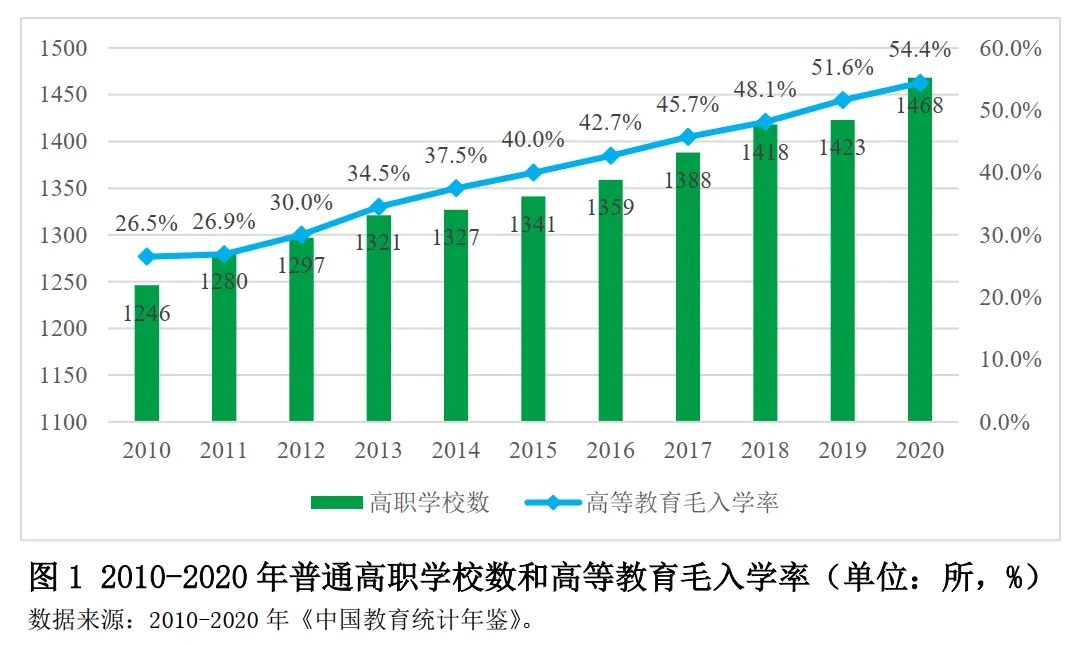 第一,我國(guó)高等職業(yè)教育仍處于規(guī)模擴(kuò)張階段。高職學(xué)校數(shù)量從2010年的1246所增加到2020年的1468所,十年間增長(zhǎng)了17.82%。高職在校學(xué)生數(shù)十年間增長(zhǎng)了32.55%。高職教育經(jīng)費(fèi)投入逐年增長(zhǎng),生均教育經(jīng)費(fèi)投入高于2.2萬(wàn)元。
