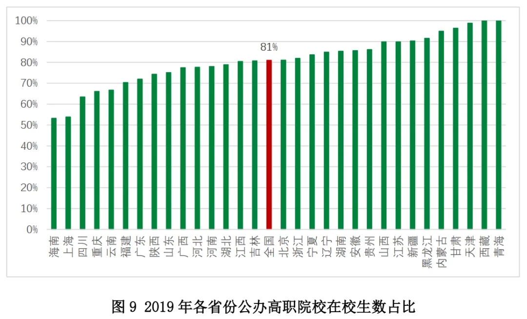 2019年,我國(guó)高等職業(yè)院校中公辦學(xué)校占比的中位數(shù)為80%,各省份公辦高職學(xué)校比例差異較大。西部和中部地區(qū)的公辦高職學(xué)校比例較高,其中西藏、青海、寧夏等省份的高職學(xué)校全部為公辦;山西、甘肅等省份的公辦高職院校比例也已超過(guò)90%;東部和東北地區(qū)的公辦高職學(xué)校比例相對(duì)較低,其中海南、上海等省份的公辦院校比例低于60%。(圖8)