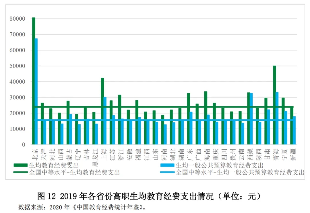 圖12反映了2019年各省份高職生均教育經(jīng)費(fèi)支出情況及各省份之間的差異。整體而言,各省份的高職生均教育經(jīng)費(fèi)支出情況與生均一般公共預(yù)算教育經(jīng)費(fèi)支出情況類似,北京、青海、上海、西藏四個(gè)省份均位居前列,而黑龍江、山西、遼寧、河南四個(gè)省份均墊底。