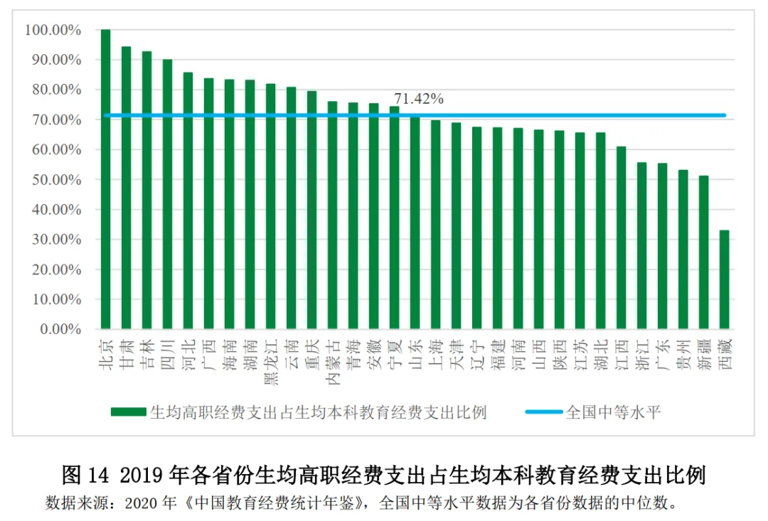 與本科生均教育經(jīng)費(fèi)支出相比,全國(guó)高職院校生均教育經(jīng)費(fèi)支出的中位數(shù)約為省本科生均教育經(jīng)費(fèi)支出的71.42%。其中,北京、吉林、甘肅和四川的高職院校生均教育經(jīng)費(fèi)支出占本科生均教育經(jīng)費(fèi)支出的比例超過(guò)90%,較為接近同省本科投入水平。同時(shí),西藏、新疆、貴州占比較低,約為同省本科投入水平的50%。(圖14)