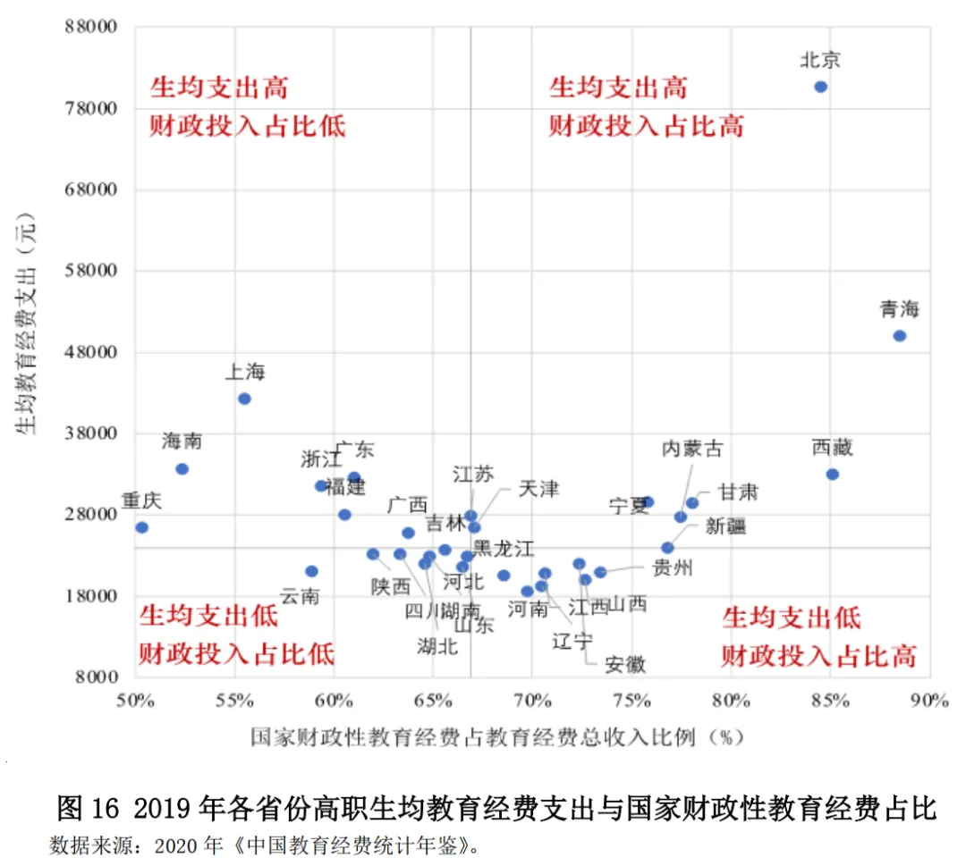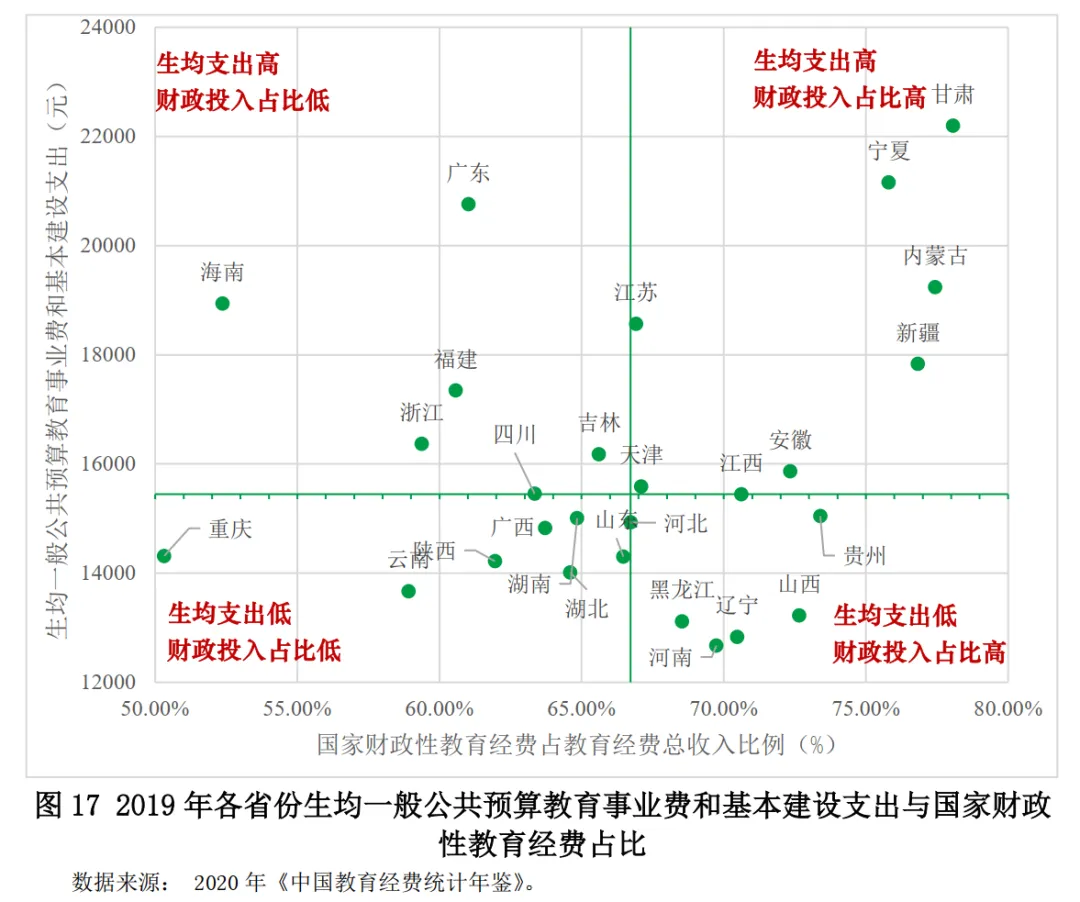 從生均教育經(jīng)費(fèi)支出水平與財(cái)政投入程度(以國(guó)家財(cái)政性教育經(jīng)費(fèi)占教育總經(jīng)費(fèi)收入的比例來(lái)衡量)的關(guān)系來(lái)看,各省份可以分為四種類型:(1)多數(shù)西部地區(qū)(例如青海、西藏、甘肅、新疆等)和北京屬于生均教育經(jīng)費(fèi)支出和財(cái)政投入程度都較高地區(qū);(2)上海、廣東、福建、浙江等東部地區(qū)的生均教育經(jīng)費(fèi)支出較高、但財(cái)政投入程度相對(duì)較低;(3)河南、江西等省份雖然財(cái)政投入程度較高,但是生均教育經(jīng)費(fèi)支出較低;(4)云南、陜西、湖北、湖南等西部和中部省份的生均教育經(jīng)費(fèi)支出和財(cái)政投入程度均處于較低的水平。(圖16)