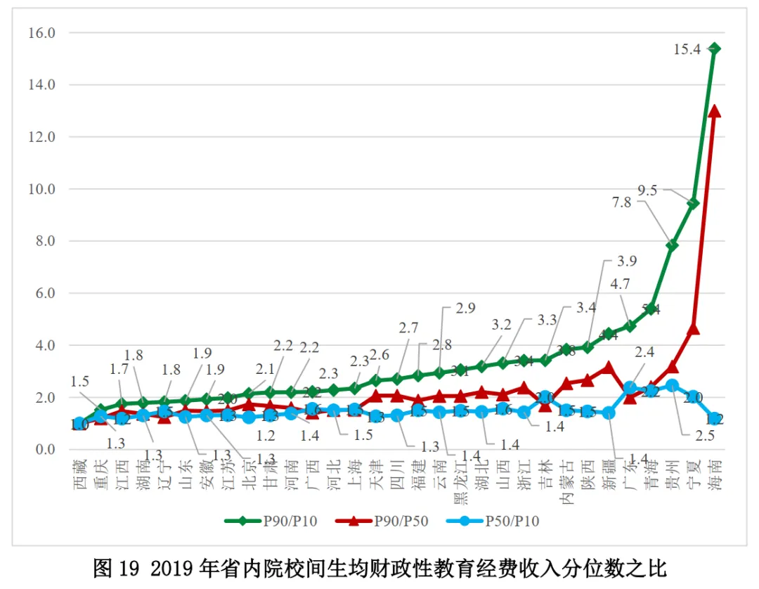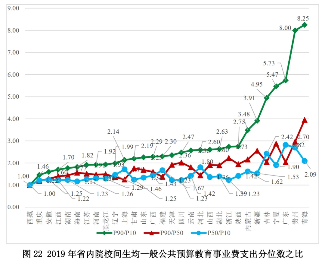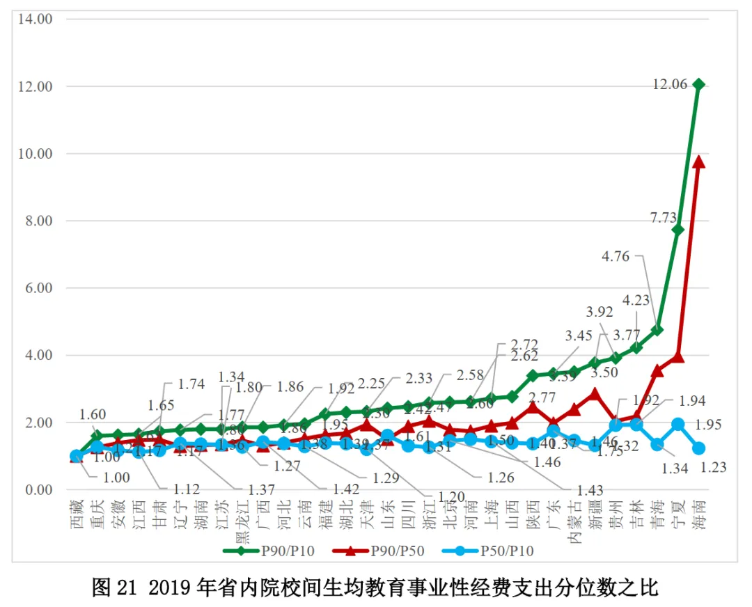 2019年各省份生均教育事業(yè)性經(jīng)費(fèi)支出的分位數(shù)之比表明:(1)西藏、重慶、安徽的省內(nèi)均衡性均位居前列;(2)海南、寧夏、青海位居最末。其中,海南、寧夏、青海內(nèi)部生均教育事業(yè)性經(jīng)費(fèi)支出的最高90%的學(xué)校與最低10%學(xué)校差異最大,且這種差異主要是由于最高90%與中位數(shù)學(xué)校的差異過(guò)大,這表明這三個(gè)省份內(nèi)部教育經(jīng)費(fèi)投入的均衡性相對(duì)較差。(圖21)