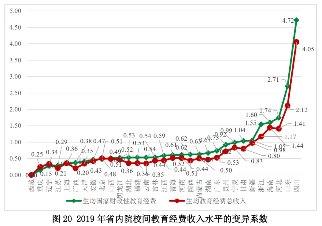 從2019年各省份生均教育經(jīng)費(fèi)收入和生均財(cái)政性教育經(jīng)費(fèi)收入的變異系數(shù)來(lái)看:(1)西藏、重慶、遼寧、江蘇的省內(nèi)均衡性位居前列,變異系數(shù)小于0.4;(2)四川、山東、河北和海南位居最末,變異系數(shù)大于1.0。山東和四川兩個(gè)指標(biāo)的變異系數(shù)大于2.0,遠(yuǎn)高于省際間同類指標(biāo)的變異系數(shù)。除了少數(shù)例外,各省份的生均財(cái)政性教育經(jīng)費(fèi)收入變異系數(shù)均大于生均教育經(jīng)費(fèi)總收入的變異系數(shù),這表明財(cái)政性投入沒(méi)有縮小省內(nèi)院校間的收入差距。(圖20)
