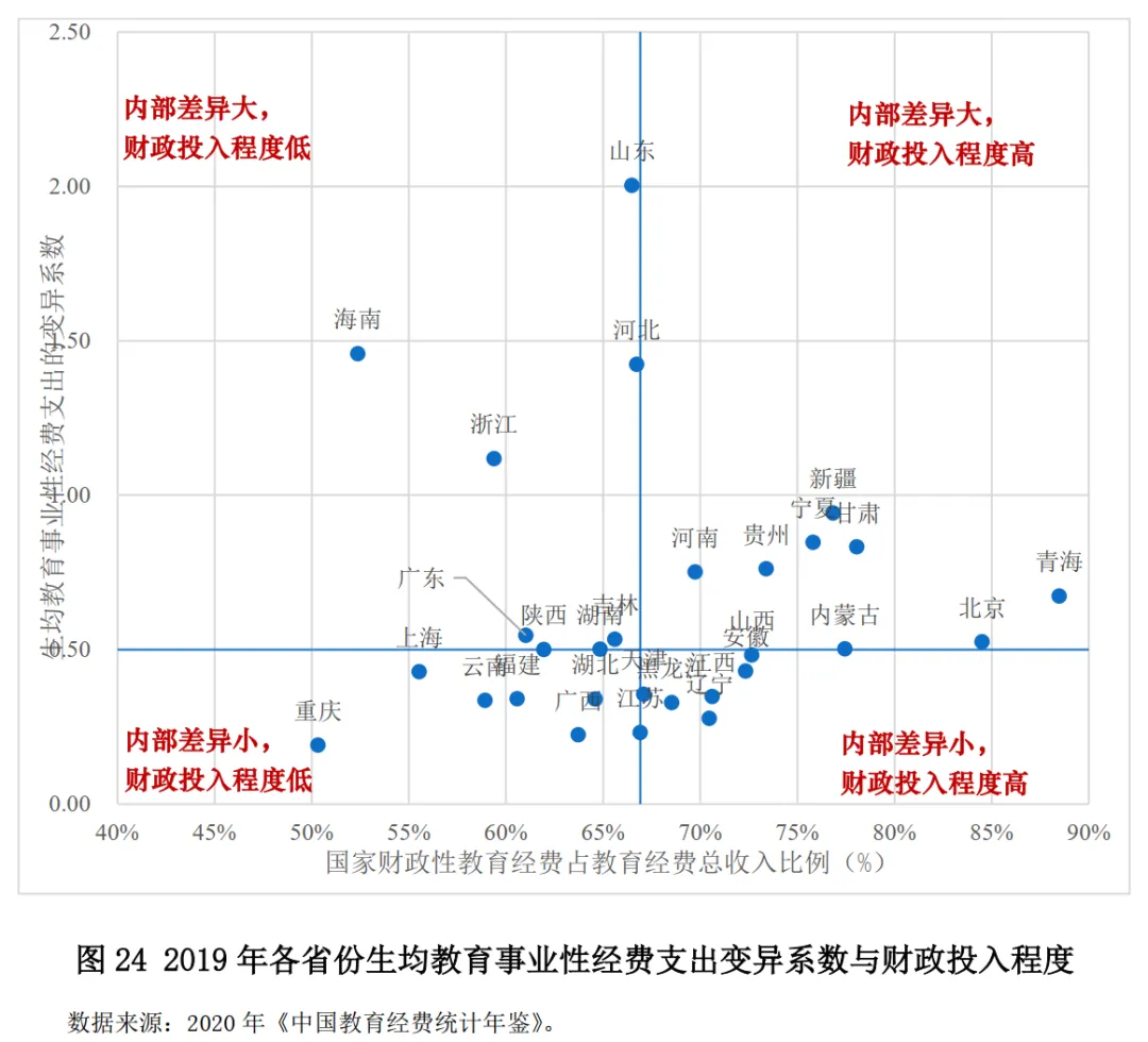 從生均教育事業(yè)性經(jīng)費(fèi)支出的變異系數(shù)與財(cái)政投入程度來(lái)看,(1)廣東、海南、浙江等省份內(nèi)部的院校間均衡性較弱;(2)廣西、江蘇、遼寧、重慶等省份內(nèi)部的院校間均衡性較強(qiáng);(3)在內(nèi)部差異較大省份中,海南、浙江、廣東等省份的財(cái)政投入程度較低,多數(shù)西部省份和北京的財(cái)政投入程度較高;(4)在內(nèi)部差異性較小的省份中,重慶、上海、云南等省份的財(cái)政投入程度較低,安徽、江西、遼寧、黑龍江等中部和東北地區(qū)省份的財(cái)政投入程度相對(duì)較高。(圖24)