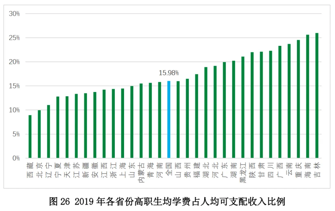 從全國(guó)范圍來(lái)看,我國(guó)高職教育的人均居民負(fù)擔(dān)率為15.98%,折合家庭負(fù)擔(dān)率約6.10%(注:通過(guò)第七次人口普查的家庭戶規(guī)模2.62折算,家庭負(fù)擔(dān)率折算為9.08%)。此外,各省份高職教育的人均居民負(fù)擔(dān)率差距較大,吉林為25.97%,顯著高于其他省份;西藏最低,為8.92%,最高和最低的兩個(gè)省份相差約2倍。除吉林、海南和西藏外,其他省份的高職教育人均居民負(fù)擔(dān)率均處于10%~25%的區(qū)間內(nèi)。(圖26)