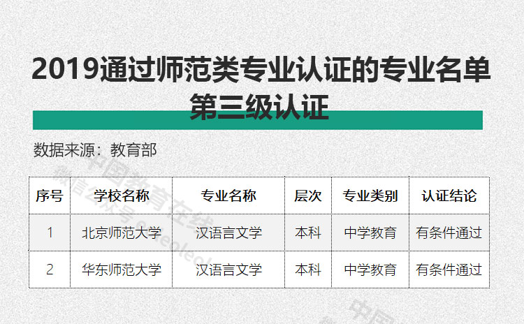 教育部公布的2019年通過普通高等學校師范類專業(yè)認證的專業(yè)名單中,北京師范大學及華東師范大學的漢語言文學專業(yè)分別通過第三級專業(yè)認證。(備注:通過第三級認證的專業(yè),在認證結論有效期內入學的師范生,可由高校自行組織中小學教師資格考試筆試和面試工作。)
