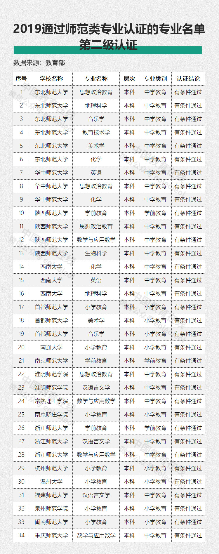 東北師范大學、華中師范大學等17所高校的34個專業(yè)通過第二級專業(yè)認證。(備注:通過第二級認證的專業(yè),在認證結論有效期內入學的師范生,可由高校自行組織中小學教師資格考試面試工作。)