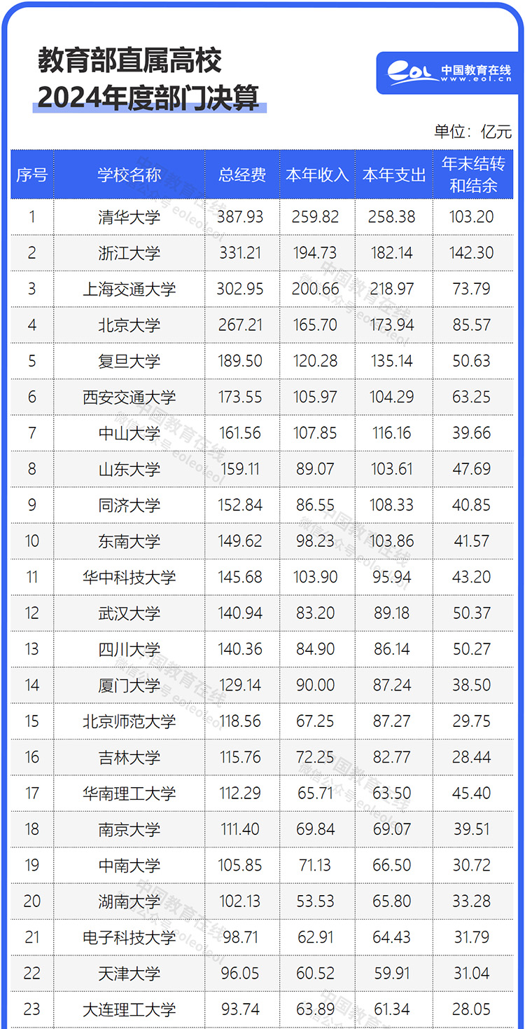 日前,75所教育部直屬高校官網(wǎng)均已公布2024年部門決算。據(jù)數(shù)據(jù)顯示,共有20所高校總經(jīng)費(fèi)過百億。