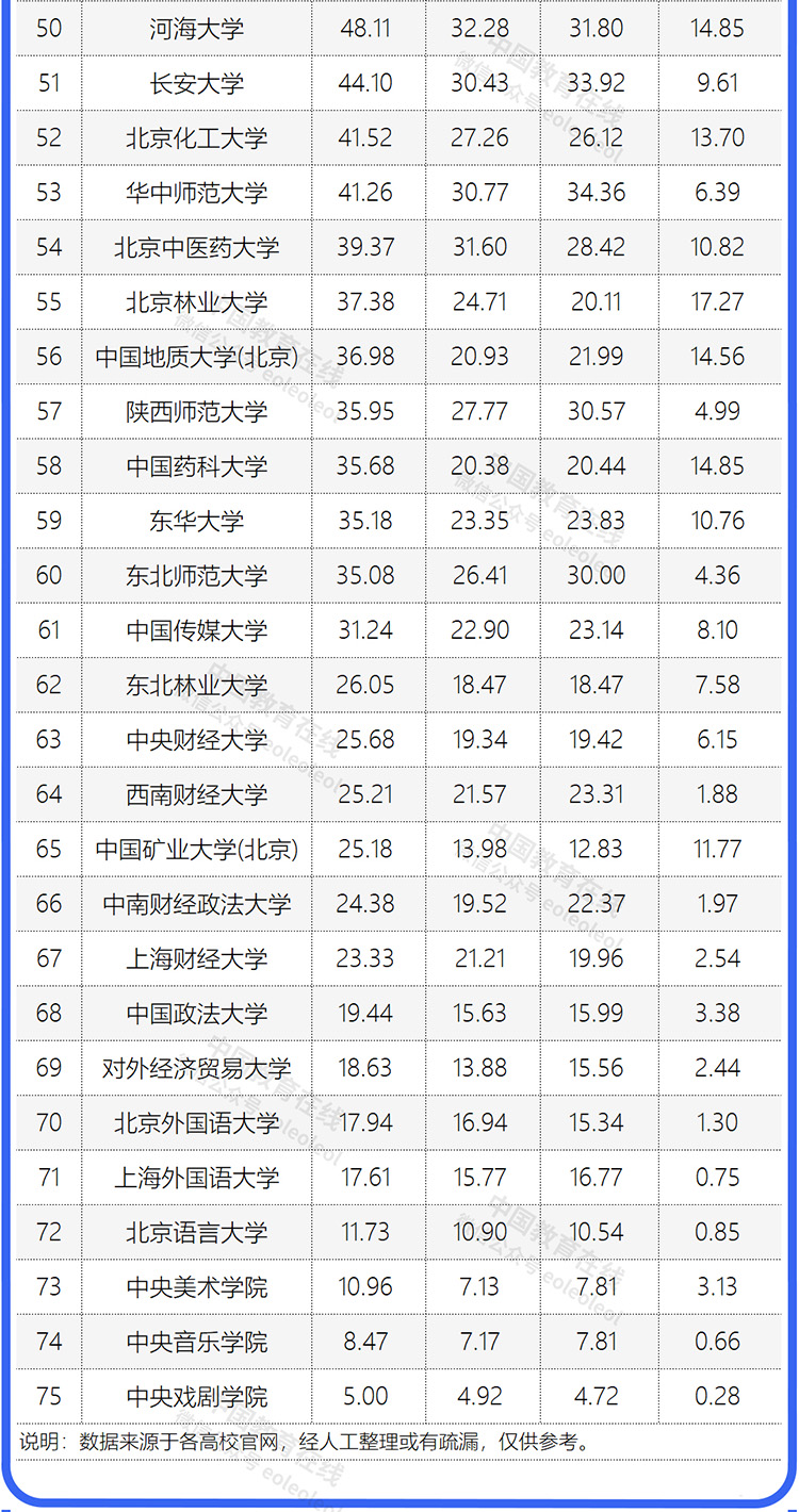 說明:本文統(tǒng)計(jì)中,華北電力大學(xué)經(jīng)費(fèi)為北京校區(qū)和保定校區(qū)合計(jì),哈爾濱工業(yè)大學(xué)、北京航空航天大學(xué)、西北工業(yè)大學(xué)等工信部直屬高校以及國(guó)科大、中科大等中國(guó)科學(xué)院直屬高校以及其他部委院校不在本文的統(tǒng)計(jì)范圍之內(nèi)。