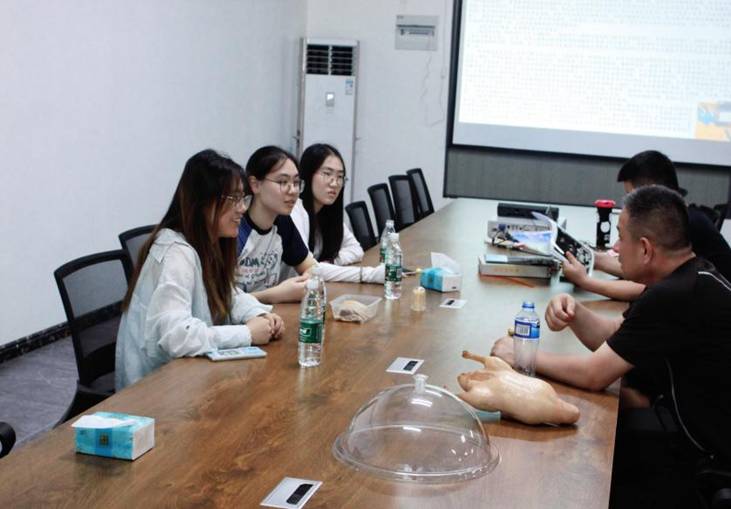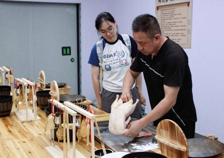 非遺工坊負(fù)責(zé)人馬曉宇、非遺傳承人馬兆凱為實(shí)踐團(tuán)成員講解南京板鴨、鹽水鴨的相關(guān)知識(shí)。 趙悅彤供圖
