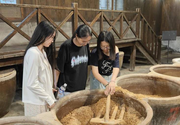 在古法釀醋工坊,實(shí)踐團(tuán)成員在傳承人的指導(dǎo)下親手體驗(yàn)了翻醅這一傳統(tǒng)工藝,他們循古法翻動(dòng)醅料,感受原料質(zhì)地的變化,在汗水與谷物的清香中,真切體會(huì)到傳統(tǒng)釀造“一分耕耘一分滋味”的堅(jiān)守,感受到“手作”的溫度。