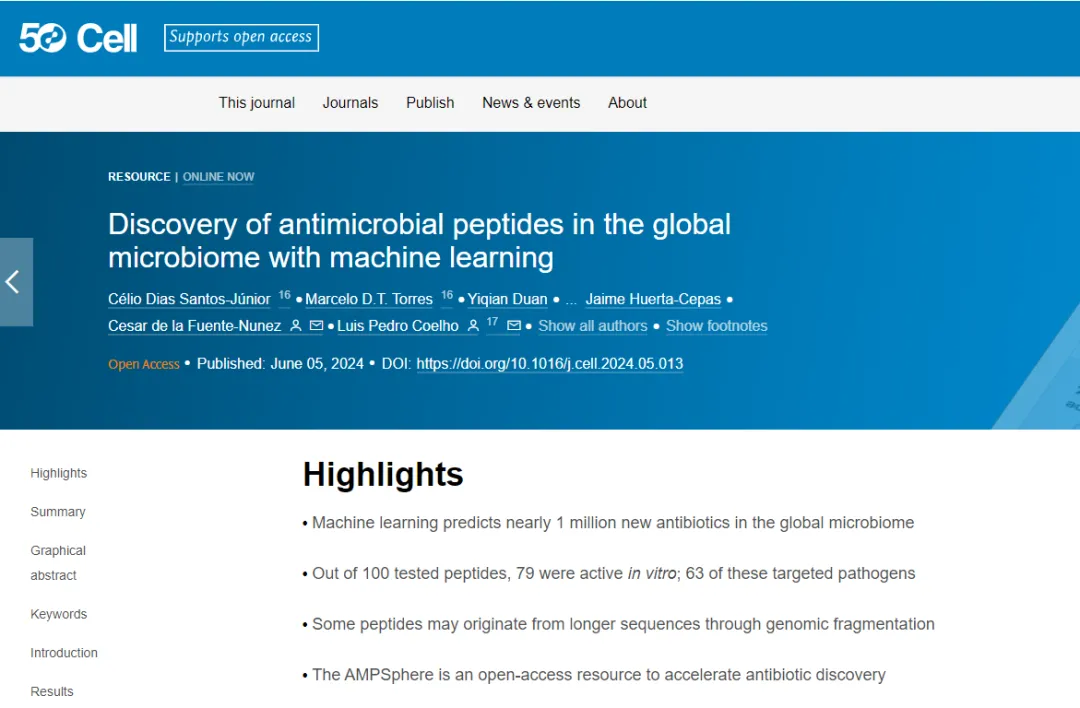 近日,復(fù)旦大學(xué)類腦智能科學(xué)與技術(shù)研究院(下文簡稱“類腦研究院”)青年研究員路易斯·佩德羅·科埃略(Luis Pedro Coelho)、名譽(yù)教授皮爾·伯克(Peer Bork)、特聘教授趙興明團(tuán)隊與來自美國與德國的科學(xué)家將人工智能與生物醫(yī)學(xué)交叉融合,從全球微生物組中預(yù)測近100萬種新型抗菌肽。相關(guān)成果以《利用機(jī)器學(xué)習(xí)發(fā)現(xiàn)全球微生物組中的抗菌肽》(“Discovery of antimicrobial peptides in the global microbiome with machine learning”)為題,在《細(xì)胞》(Cell)主刊上發(fā)表。