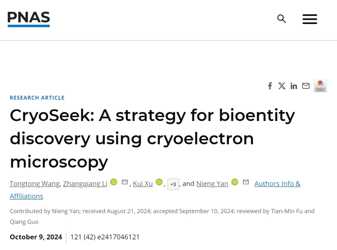 2024年10月9日,深圳醫(yī)學(xué)科學(xué)院顏寧團(tuán)隊在 PNAS 雜志(《美國國家科學(xué)院院刊》)在線發(fā)表題為 CryoSeek: A strategy for bio-entity discovery using cryo-electron microscopy(《CryoSeek:利用冷凍電鏡發(fā)現(xiàn)生物實體的研究策略》)的研究論文,研究團(tuán)隊將冷凍電鏡作為一種“發(fā)現(xiàn)”工具,拓展了人類視覺分辨率的極限,放眼大自然,發(fā)現(xiàn)完全未知的生物大分子。
