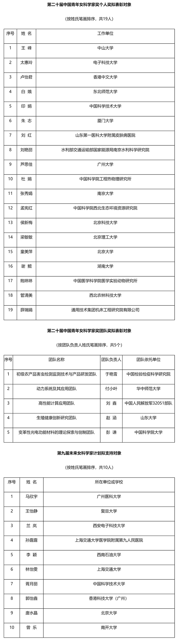 經(jīng)評(píng)審,共產(chǎn)生第二十屆中國(guó)青年女科學(xué)家獎(jiǎng)19名擬表彰人選、5個(gè)擬表彰團(tuán)隊(duì)和10名第九屆未來(lái)女科學(xué)家計(jì)劃擬支持對(duì)象。公示時(shí)間從2025年1月2日起,至2025年1月8日止。
